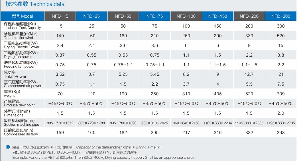 例如:欲干燥 80kg/hr 的 PET,則 ND-300 即為適當的選擇