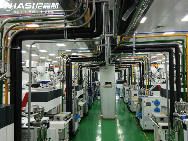 中央供料系統方案實施后,客戶車間干凈簡潔、方正,總覽整個車間,從供料房的歐化拌料機到干燥機到原料分配站再到車間注塑機,相關管路布置得當、整潔,毫無贅余。且在注塑機管道出口風管的外延連接處,經過精心的安裝修飾,用一小段軟管連接,使風管整體過度平滑...