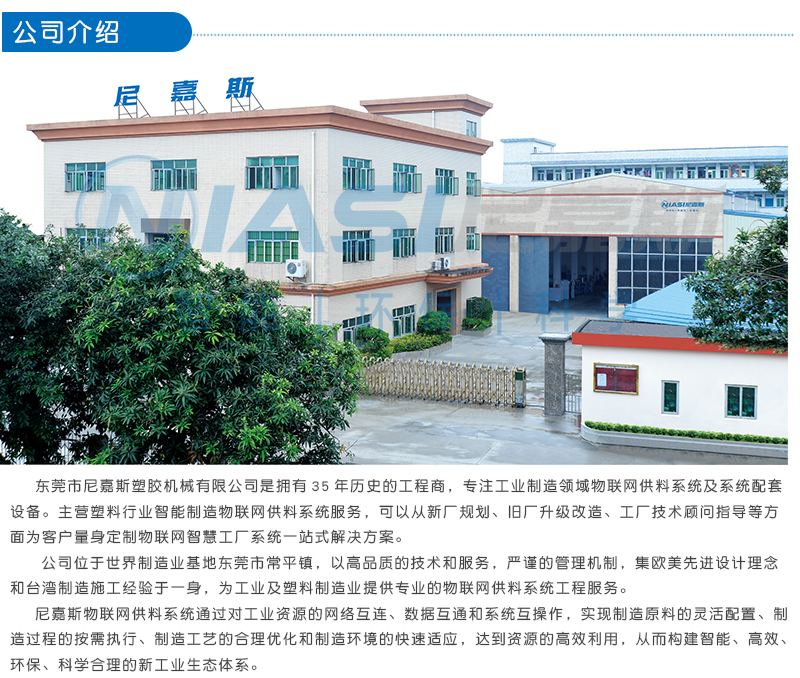 東莞市尼嘉斯塑膠機械有限公司是一家專業做塑膠車間整廠規劃的設備工程制造公司,其中包括有:中央供水系統、pet除濕干燥機-PET塑料應用行業